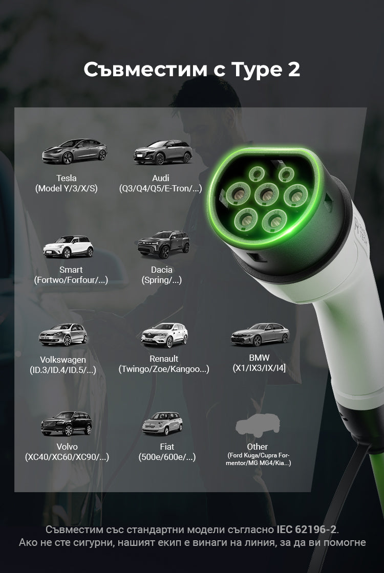 Със стандартния си конектор Type 2 този кабел е напълно съвместим с повечето модели на европейския пазар. Независимо дали карате Tesla, BMW, Mercedes-Benz или друг популярен електромобил, можете лесно да се свързвате и да зареждате.